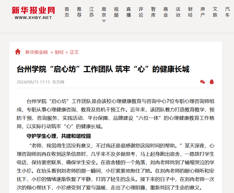 台州学院“启心坊”工作团队是由该校心理健康教育与咨询中心7位专职心理咨询师组成,专职从事心理健康咨询、教育及危机干预工作。近年来,该团队着力打造教育教学、预防干预、咨询服务、实践活动、平台保障、品牌建设“六位一体”的心理健康教育工作格局,以实际行动筑牢“心”的健康长城。
