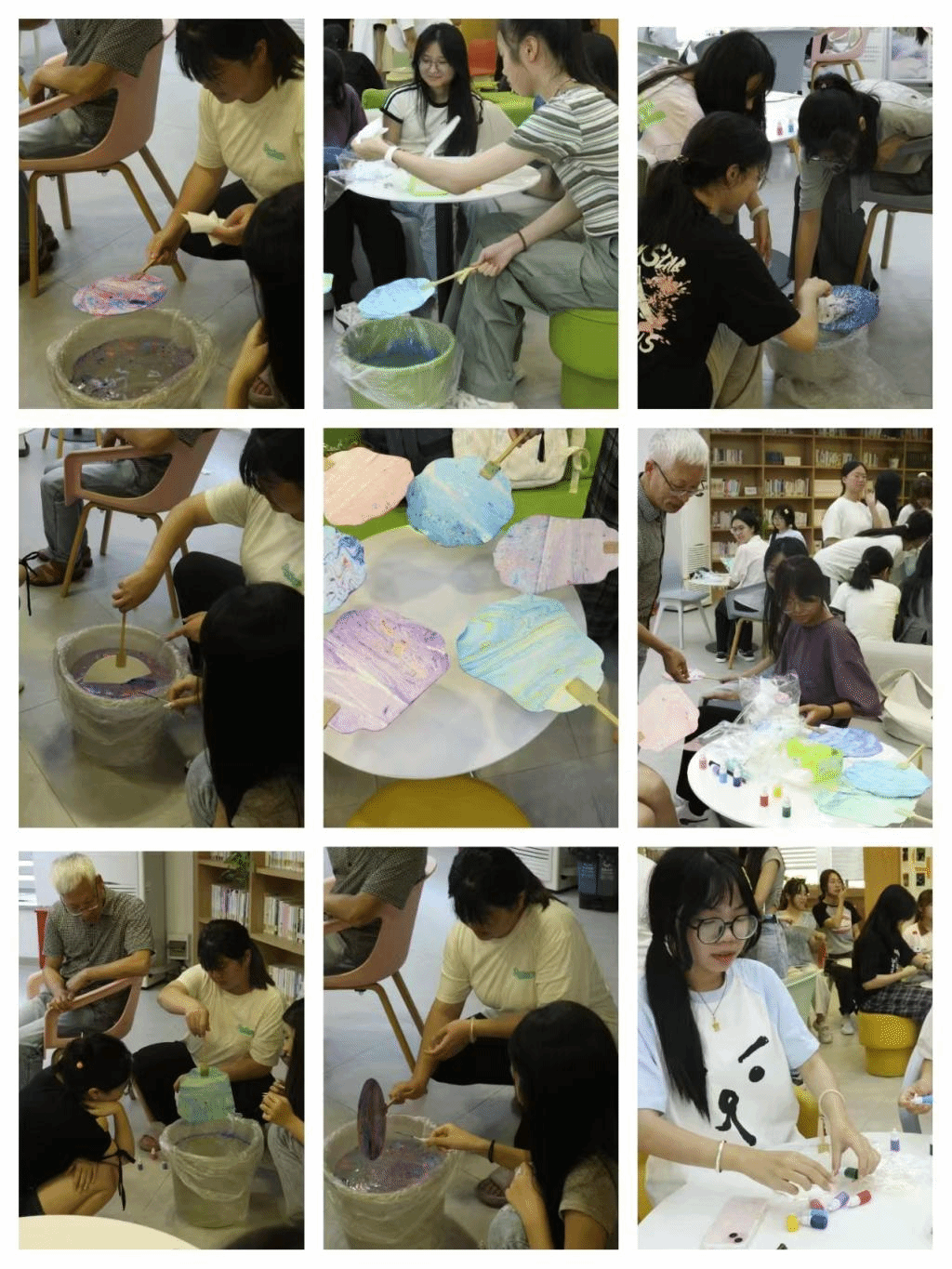 活动伊始,胡正武院长讲述了教师节的由来,同时分享了自己与教师节相关的经历。随后,主持人播放了一段漆扇制作的视频,使学生们对漆扇制作的流程有所了解。视频播放完毕,学生们怀着跃跃欲试的心情挑选了自己心仪的扇型和漆油,迫不及待地投入到制作之中。在将漆油滴入水中之后,学生们用小棍进行搅拌。搅拌完成后,学生们神色专注且小心翼翼地把扇子浸入水中,让扇子均匀上色。水盆前逐渐排起了队伍,前一位学生完成操作后,会用纸巾吸干水面残留的漆油,后一位学生则在水中滴入自己喜爱的颜色。不多时,学生们均完成了制作。他们举着自己的作品,兴致盎然地与同伴交流制作感想,并且纷纷用镜头记录下这一时刻,绚丽的色彩与学生们灿烂的笑容相映成趣。