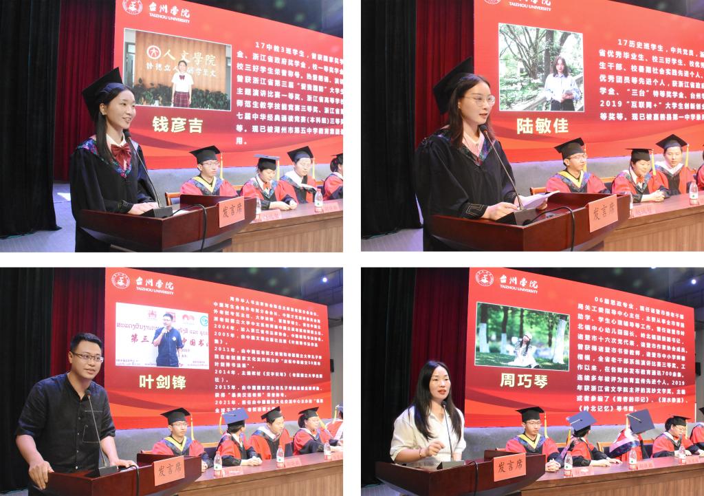 毕业生钱彦吉和陆敏佳代表全体毕业生进行发言,他们讲述了自己在人文学院的收获与成长,表达出对母校、师长和同学的感激与不舍,并对未来做出了美好的展望;06届优秀校友代表叶剑锋、周巧琴应邀出席,为毕业生们带来祝福。他们在致辞中表达出对母校的感激与眷恋,亦结合自己的人生经历,给毕业生们送上寄语,期待2021届毕业生心怀勇敢与理想,迎接更加灿烂的未来。