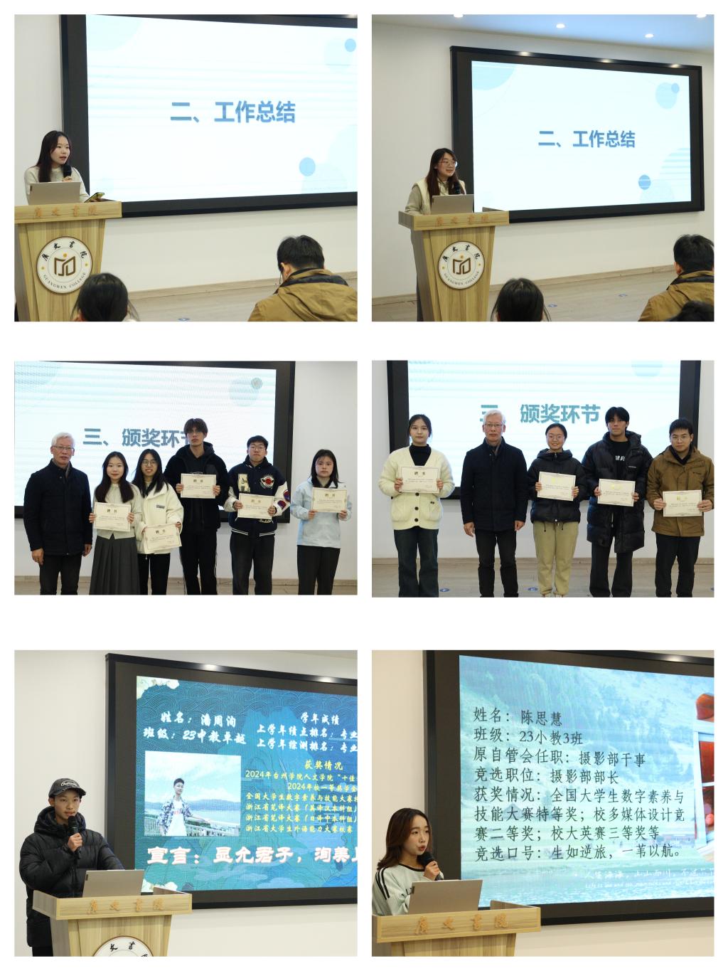书院自管会各部门负责人汇报了过去一年的工作成果。他们不仅回顾了各自部门的努力与成果,还特别表扬了学弟学妹在工作中展现出的统筹才能与辛勤付出,鼓励他们继续发扬团结协作精神,携手共进,继续做好书院的工作。随后,胡院长为各部门颁发了荣誉奖状。