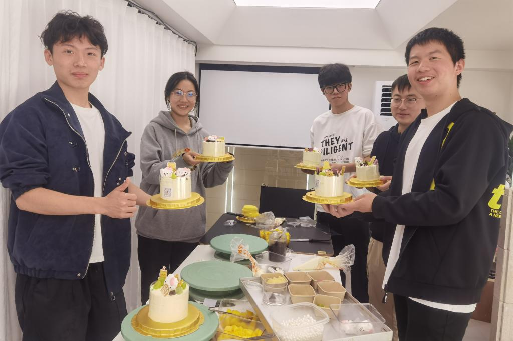 蛋糕装饰环节氛围热烈。同学们习得抹面、裱花技巧后,以奶油、水果等为素材创意设计,将蛋糕胚打造成专属作品。过程中大家互帮互助,分享操作技巧,让手作温度在协作中传递。