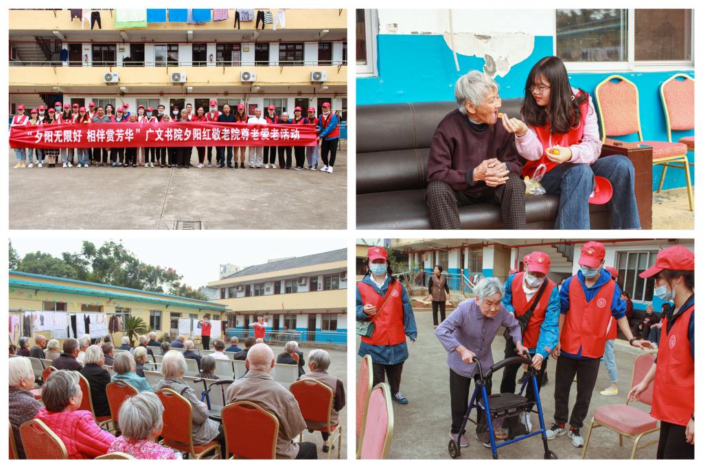 10月18日,鲁建波老师与广文书院志愿者前往夕阳红敬老院看望老人。志愿者们给老人打扫房间,向老人献上礼物,陪老人聊天,送去一份关爱和温暖。随后志愿者还进行了才艺表演和集体大合唱,向老人送去欢乐。期间一位老人还为大家唱了一段戏剧并表示生于旧社会,养老新社会,要感谢党和国家领导,同时对书院师生的到来感到开心。养老院院长也讲述了她办敬老院的过程及对未来居家养老的美好期盼。