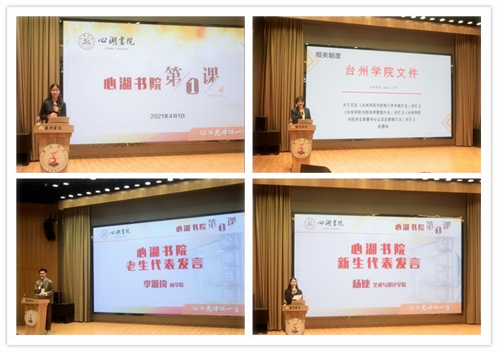 刘贵花从书院概况、书院文化、书院机制、书院品牌等方面带领与会师生进一步认识了心湖书院。姚卓琳就《台州学院书院制工作实施办法(试行)》及《台州学院书院学生荣誉学分认定及管理办法(试行)》等制度进行了介绍,并介绍了心湖书院学生自我管理委员。来自艺术学院的杨婕、商学院的李源琦分别代表书院新老生上台发言。