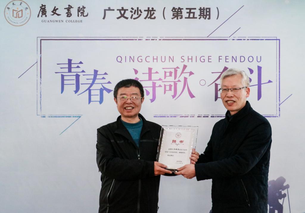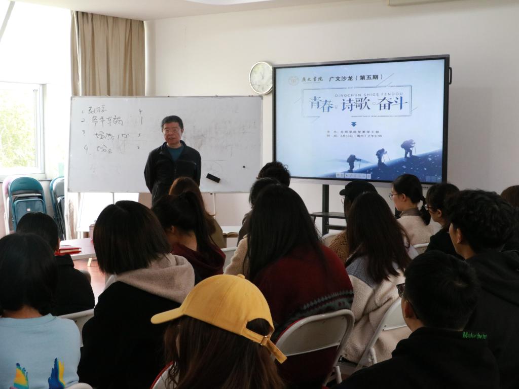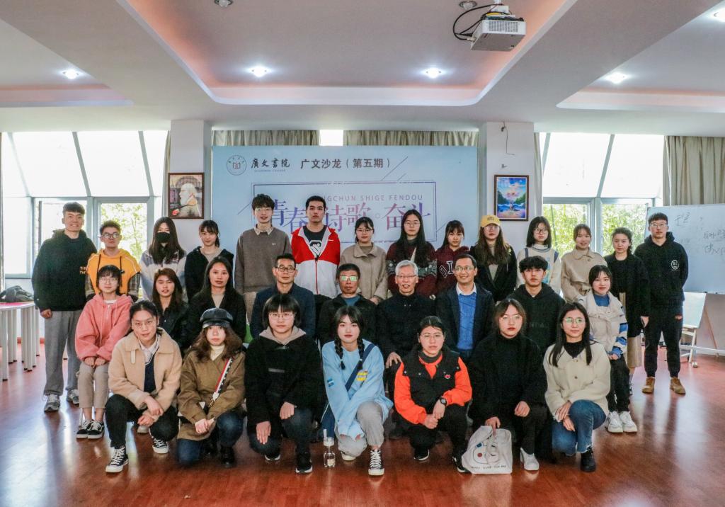 3月13日,以“青春•诗歌•奋斗”为主题的第五期广文书院沙龙活动于学生活动中心202举行。本次沙龙邀请优秀校友苏明泉进行交流,广文书院院长胡正武、党委学工部副部长马斌、广文书院副院长鲁建波以及广文书院辅导员黄廷美出席,部分书院学生及自管会成员参加活动。