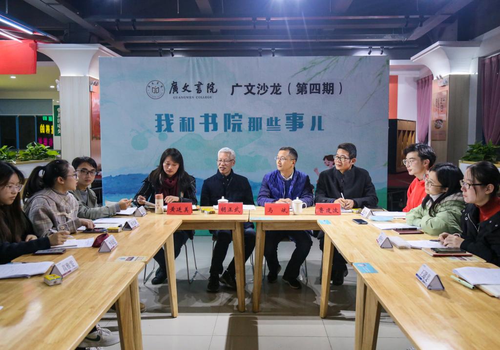为进一步推进书院建设,完善书院人才评定体制,提高育人工作成效,12月28日晚,广文书院以“我与书院那些事儿”为主题,开展了第四期沙龙活动。活动分为交流会、座谈会两部分。书院院长胡正武、学工部副部长马斌、副院长鲁建波、辅导员黄廷美及书院学生代表共同参加。