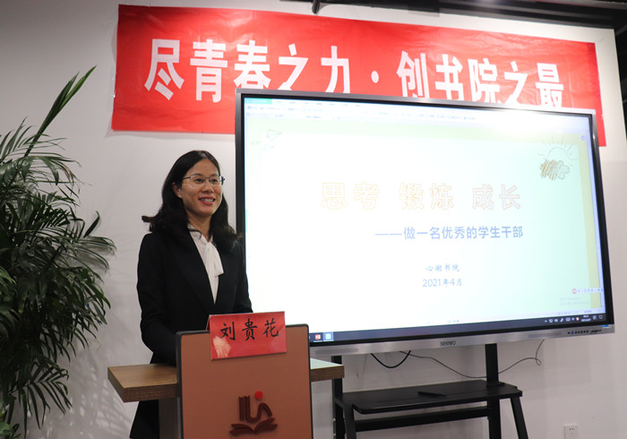 最后,刘贵花以“思考锻炼成长——做一名优秀的学生干部”为题作总结讲话,抛出“为什么选择担任学生干部?”以及“担任学生干部后自己有什么改变?”两个问题,引发学生干部们的思考。她从学生干部应该具有“三种素质”、“六种意识”、“五个能力”三个方面,指出学生干部应该练就过硬的政治素质、提升专业知识涵养、加强心理素质和抗压能力;找准工作定位,树立正确的角色意识、把握大局意识、增强服务意识、重视民主意识、学习创新意识、加强时间意识;通过各项工作的开展,从而提升组织策划能力、创新思维能力、人际交往能力、工作执行能力、解决问题能力;她希望各位学生干部秉承“服务他人,成就自我”的理念,平衡好好学习与工作、师生与学生之间的关系,努力做一个心中有爱、腹中有墨、胸中有识、肩上有担、目中有人的“五有”好干部。