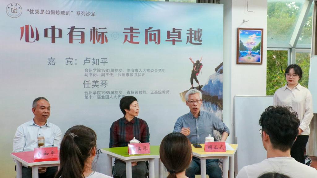 活动开始,任美琴老师围绕“心中有标,走向卓越”主线,对同学们提出五点希望:一是希望同学们树立自己的目标,一步步走向卓越;二是希望同学们注重学习,认识到学习是教师之本,学科的专业素养、深厚的知识底蕴和自如的教学能力对于教师的重要性;三是希望同学们多思考,思考是成功之路,只有经过思考研究教学质量才能提高;四是希望同学们多实践,行动和实践是教师成长之路,在教师生涯中有着极其重要作用;五是希望同学们“心中有标”,做到“目标、学习、思考、行动、卓越五位一体”。最后,任美琴老师以五句话与大家共勉,希望同学们在不断努力和实践中磨砺自己。之后,卢如平老师从自身经历出发,讲述高考的恢复对自身的重大意义,在台州师专的学习让自己终生受益,并且补充介绍了台州学院的校史,让同学们收获颇丰。最后,卢如平老师希望同学们有着深厚的知识功底,不断实践,不断积累,提升自身素养,形成终身学习的良好习惯。