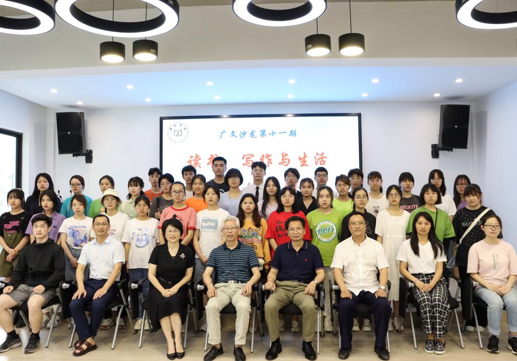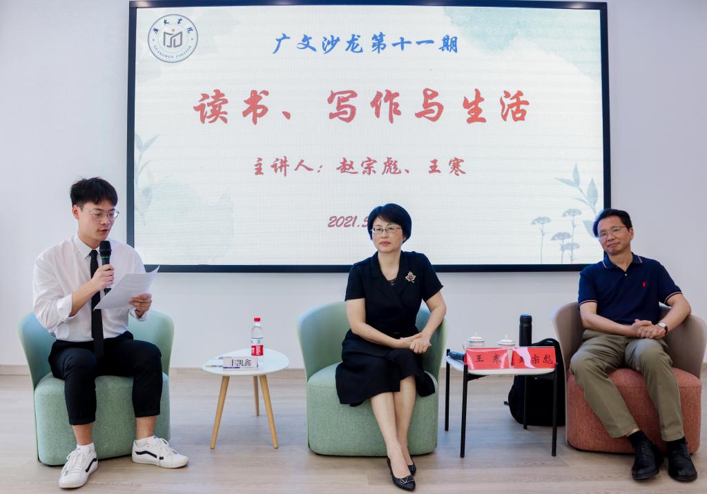 5月15日下午,第十一期广文沙龙在广文书院多功能厅举行,邀请优秀校友木刻艺术家赵宗彪、台州乡土作家王寒参加“读书、写作与生活”主题活动。书院院长胡正武、党委学工部副部长马斌、辅导员黄廷美及50多名书院学员参加,书院学员丰凯鑫主持活动。