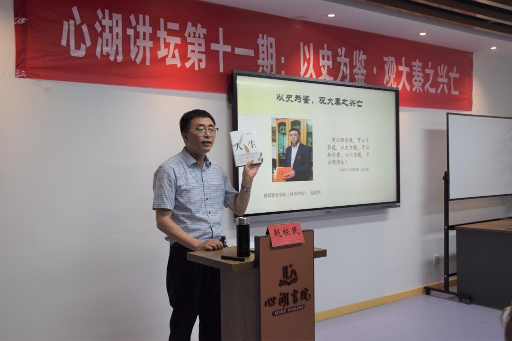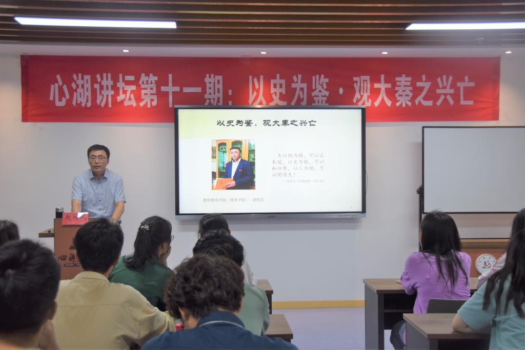 6月2日晚,心湖讲坛第十期在心湖书院多功能活动室举行。教师教育学院(体育学院)党总支书记赵校民应邀为心湖学院作题为“以史为鉴,观大秦之兴亡”的专题讲座,学员黄少绮主持讲坛,书院学子共同参加。