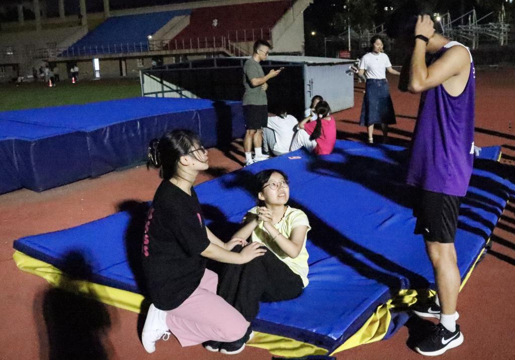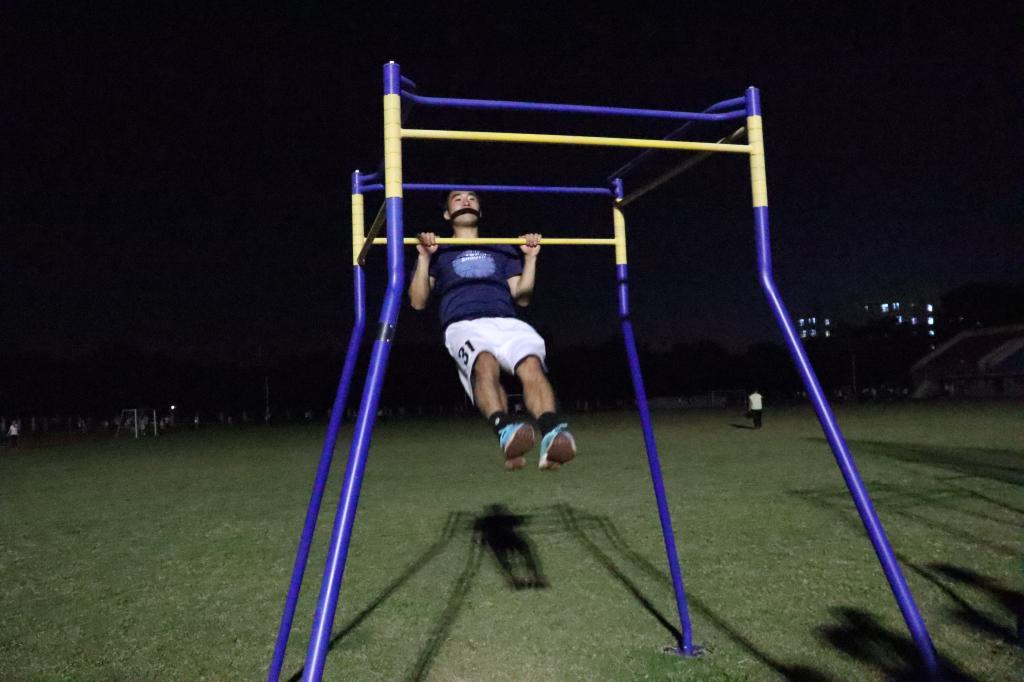 理论指导结束后就是实战演练,黄廷美老师和指导员实时观察并指导学员,分别规范了学员们在仰卧起坐和引体向上项目的技巧动作,针对力量不足提出训练建议,为学员们做了标准的动作示范。关于仰卧起坐,指导员利用腹直肌收缩,迅速成坐姿,上体继续前屈进行连续动作;关于引体向上,首先需要背部发力,借助摆动身体急停的惯性,双手向上拉杠。天色已晚,同学们的练习热情依旧高涨,指导员们一遍又一遍耐心地做着示范动作,黄老师站在一旁,认真地给予学员们意见,这成为了操场上一道靓丽的风景线。