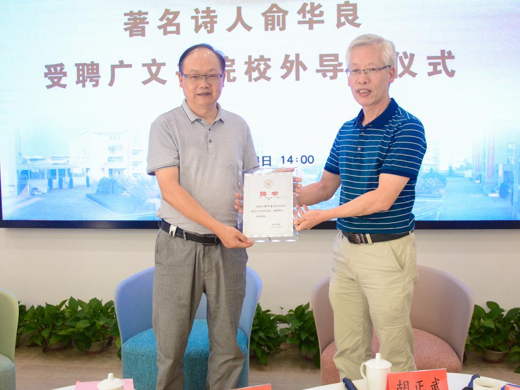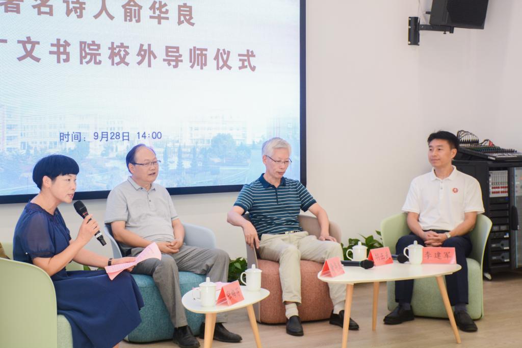 9月28日,著名诗人俞华良受聘广文书院校外导师仪式在广文书院学术报告厅举行。本次受聘仪式由学工部部长张梅芬主持,人文学院院长李建军、广文书院院长胡正武出席,40多名人文学院学生参加。举行受聘仪式后,俞华良老师作了题为“日常生活里的诗与远方”的讲座。