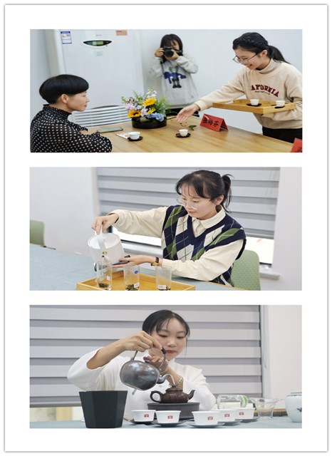 之后,徐凤君老师对本次茶会作了简单讲解,她表示虽然同学们的学习时间很短,但是他们都以极高的热情投入练习,彰显了台院学子认真勤恳的学习态度。在中华上下五千年的历史长河中,茶文化占据了十分重要的地位,是民族自信的充分体现。本次茶会将展示六大茶类的冲泡过程以及学员们的学习成果,让在座的来宾了解茶会——不单单只有茶,还由挂画、插花等文化元素组合而成。接下来“普洱茶壶泡法”、“红茶盖碗冲泡法”、“冰清玉洁玻璃杯冲泡法” 等泡法的展示,以及“茶与人生”的表演,给人以心灵的宁静,营造了一种和平的气氛。