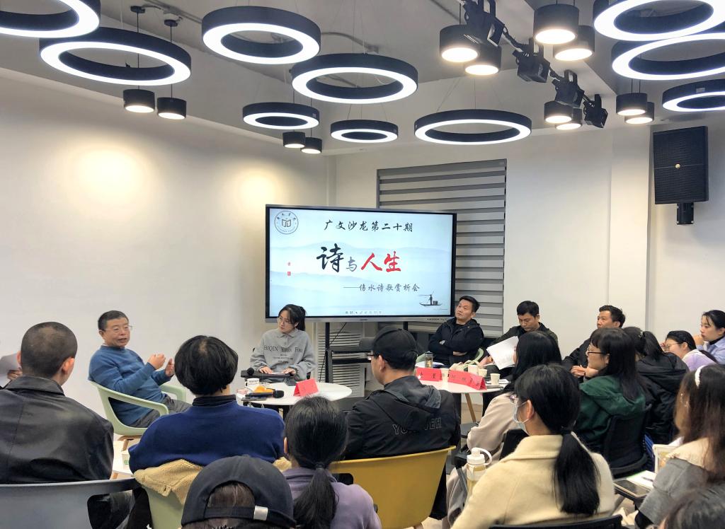 11月18日晚,以“诗与人生”为主题的第二十期广文书院沙龙活动在多功能厅举办。本次沙龙邀请优秀校友、诗人苏明泉与广文书院师生进行交流。张弛、陈十八、念南、老屋、阿根等诗人出席,书院辅导员黄廷美、主持人陈飞雪和书院学员参加活动。