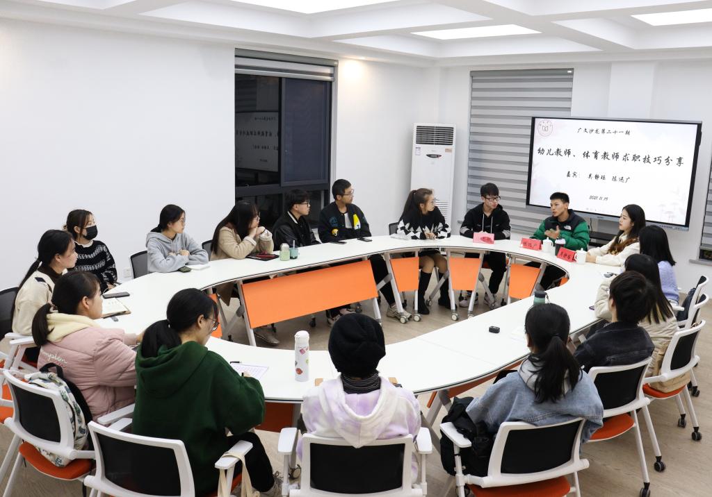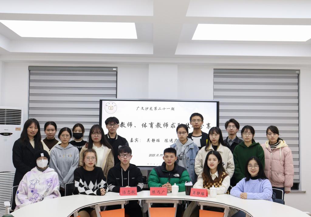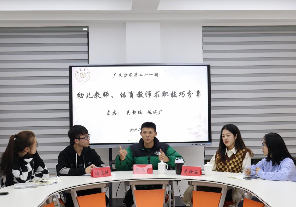 为了帮助学员们了解求职的相关信息,11月19日,第二十一期广文沙龙在广文书院师生研讨室(三)举行。台州学院18学前1班吴静瑶、18体教1班陈迅广带来“幼儿教师、体育教师求职技巧分享”沙龙。本次沙龙由广文书院学员汤志航主持,书院辅导员黄廷美出席活动,部分书院学员参加。