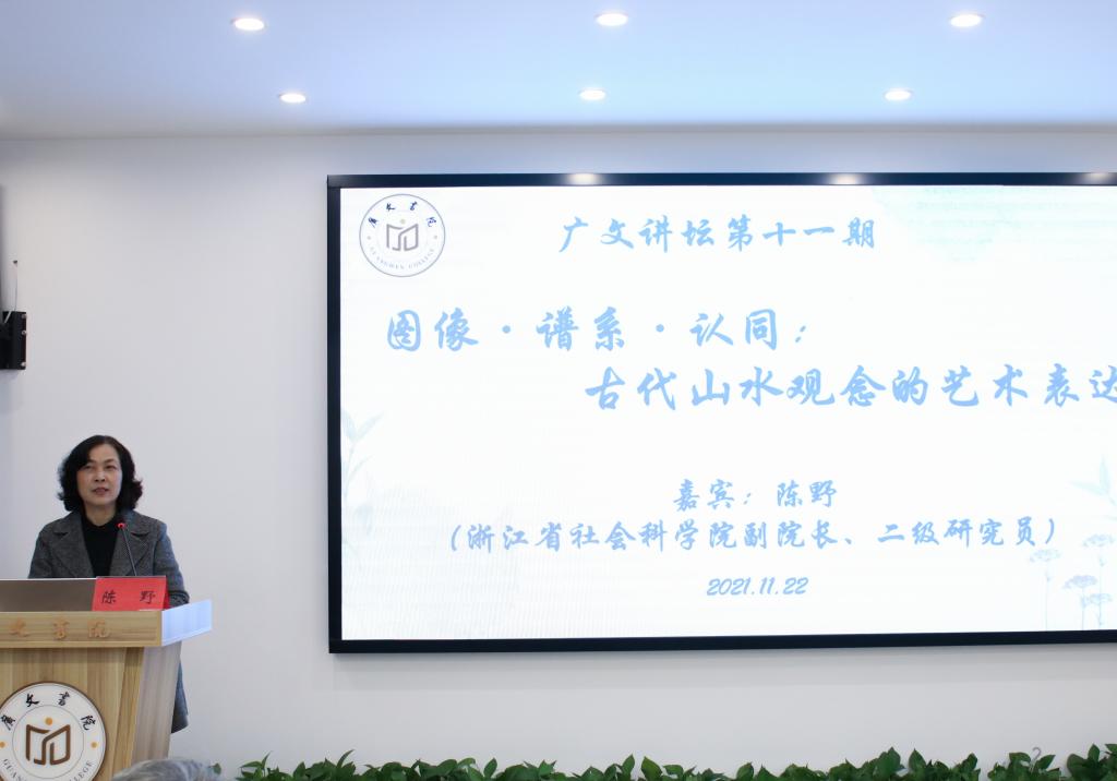 11月22日晚上,第十一期广文讲坛在广文书院多功能厅举行。浙江省社会科学院副院长、二级研究员陈野作题为“图像·谱系·认同:古代山水观念的艺术表达”的讲座。广文书院院长胡正武主持,人文学院院长李建军、学工部副部长马斌、学校部分老师以及广文书院学员五十余人参加。