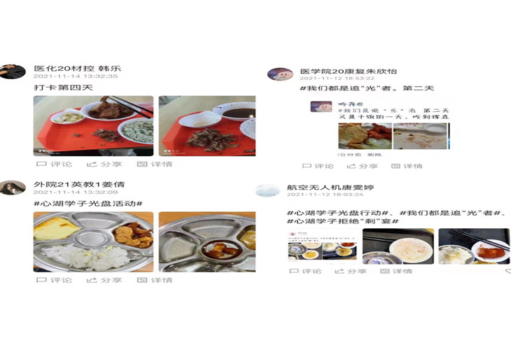 为继续推行“光盘行动”,坚持营造浪费可耻、节约为荣的宣传教育氛围,心湖书院于11月11日——11月21日举办光盘行动第二季——我们都是追“光”者线上打卡活动,活动共吸引500余名同学,打卡率达90%。