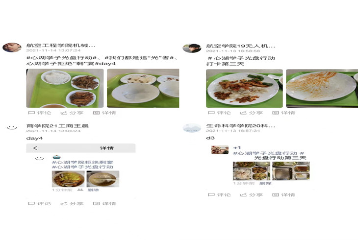 本次活动分为两个挑战阶段,每一个阶段的同学不仅需要在微信打卡小程序上进行打卡签到,还需要在微信朋友圈或QQ空间等平台分享“光盘”成果,达到互相监督的活动效果。通过这十天的打卡活动,不仅提高了同学们珍惜粮食的意识,更是将光盘行动落在实处。来自医化学院的赵欣茹同学表示,“一粥一饭,当思来之不易;半丝半缕,恒念物力维艰。将光盘作为一种道德习惯来培养” ,来自生命科学学院的李嘉东同学表示,“参与光盘活动不是一种形式上的打卡,而是提高珍惜粮食的意识。”