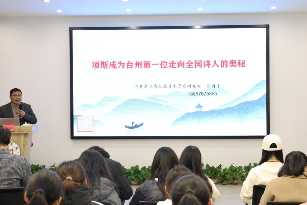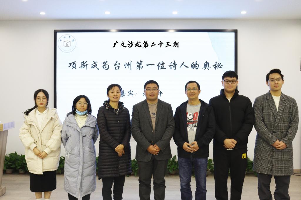11月25日晚,以“项斯成为台州第一位走向全国诗人的奥秘”为主题的第二十三期广文沙龙在广文书院多功能厅举行。本次沙龙由广文书院导师潘再平主讲,校学工部副部长马斌主持,书院辅导员黄廷美出席活动。本次沙龙吸引了部分书院学员与其他感兴趣的外国语学院、人文学院学生。