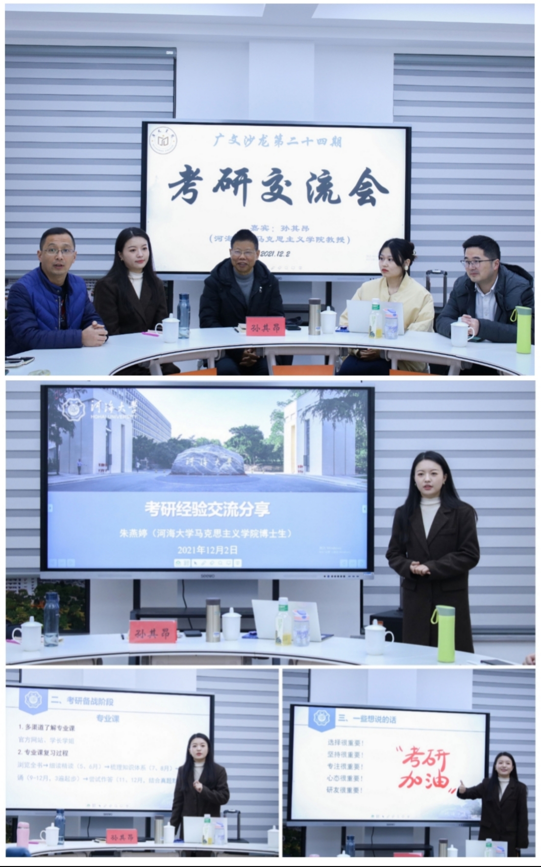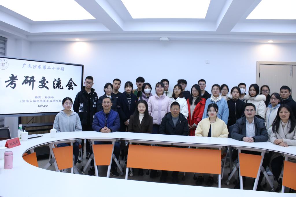 12月2日晚,考研交流会在广文书院二楼师生研讨室(三)举行。沙龙邀请了台州学院马克思主义学院三台学者、河海大学马克思主义学院教授、思想政治教育专业、社会学专业博士生导师孙其昂教授及孙教授的两位博士生。学工部副部长马斌主持沙龙,马克思主义学院副院长盛跃明和广文书院辅导员黄廷美参加,书院四十多位学员参加。