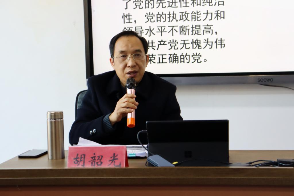 胡韶光首先对党的十九届六中全会召开的基本情况作了总体介绍,围绕“救国大业开天辟地”、“立国大业改天换地”、“富国大业翻天覆地”、“强国大业惊天动地”四个篇章,着重从“新民主主义革命时期”、“社会主义革命和建设时期”、“改革开放和社会主义现代化建设新时期”、“中国特色社会主义新时代”四个历史发展阶段,对中国共产党建党百年来所取得的伟大成绩进行了阐释。他强调,要从党的百年奋斗过程中汲取智慧力量,坚定历史自信,自觉坚守理想信念;坚持党的政治建设,始终保持党的团结统一;坚定担当责任,不断增强进行伟大斗争的意志和本领;坚持自我革命,确保党不变质、不变色、不变味。