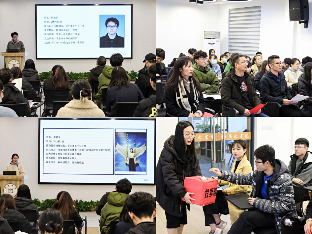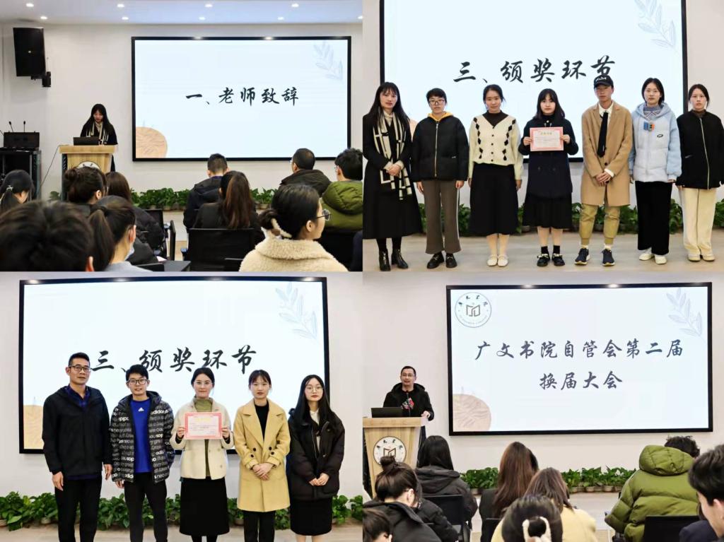 接下来,广文书院各部门负责人对一年多的工作进行了部门总结,书院对各个部门各司其职、各负其责,使各项工作顺利开展给予了充分肯定,鲁建波副院长和黄廷美老师为广文书院自管会各部门颁发了奖状,以资鼓励大家的辛勤付出。颁奖后,候选人按照抽签顺序依次上台发表竞选宣言,23位竞选者以个人演讲方式进行,参照自己的PPT对自己竞选作了介绍与陈述。每一位参加竞选的同学,都充分的展现自己,表述了自己此次竞选的职位及自身的优势与竞争力,展现了他们愿为书院付出以及对后续工作的展望。演讲结束后,老师和自管会的同学们根据形象态度、语言表达、应变能力、组织能力五个方面来为此次竞选演讲进行了投票,后续结果将进行公示。