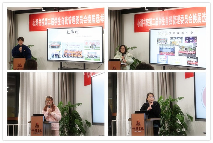 会上,心湖书院学生自管会各部门负责人对2020年度各部门工作进行了总结,他们提到,自管会与书院共成长,虽然自管会成立时间不长,但能在书院这个平台能遇到彼此,成为工作伙伴是一件幸运的事情。此外他们还对下一学年自管会的工作提出展望,希望在继承优秀活动的基础上,进一步进行优化和改良,将每一个活动办好,办成经典。随后,16位竞选者以个人演讲方式进行竞选,参照自己的PPT对自己竞选作了介绍与陈述。每一位参加竞选的同学,都充分的展现自己,表述了自己此次竞选的职位及自身的优势与竞争力,展现了他们愿为书院付出的决心以及对后续工作的展望。