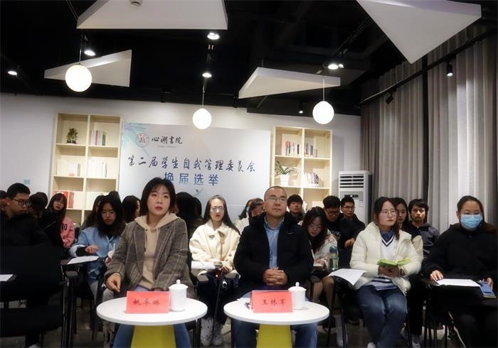 12月18日晚,心湖书院第二届学生自我管理委员会换届选举在心湖书院学习交流区举行,校党委学工部副部长王林军、心湖书院辅导员姚卓琳,全体学生自管会成员参加,本次会议由学生自管会执行主席叶陈杰主持。