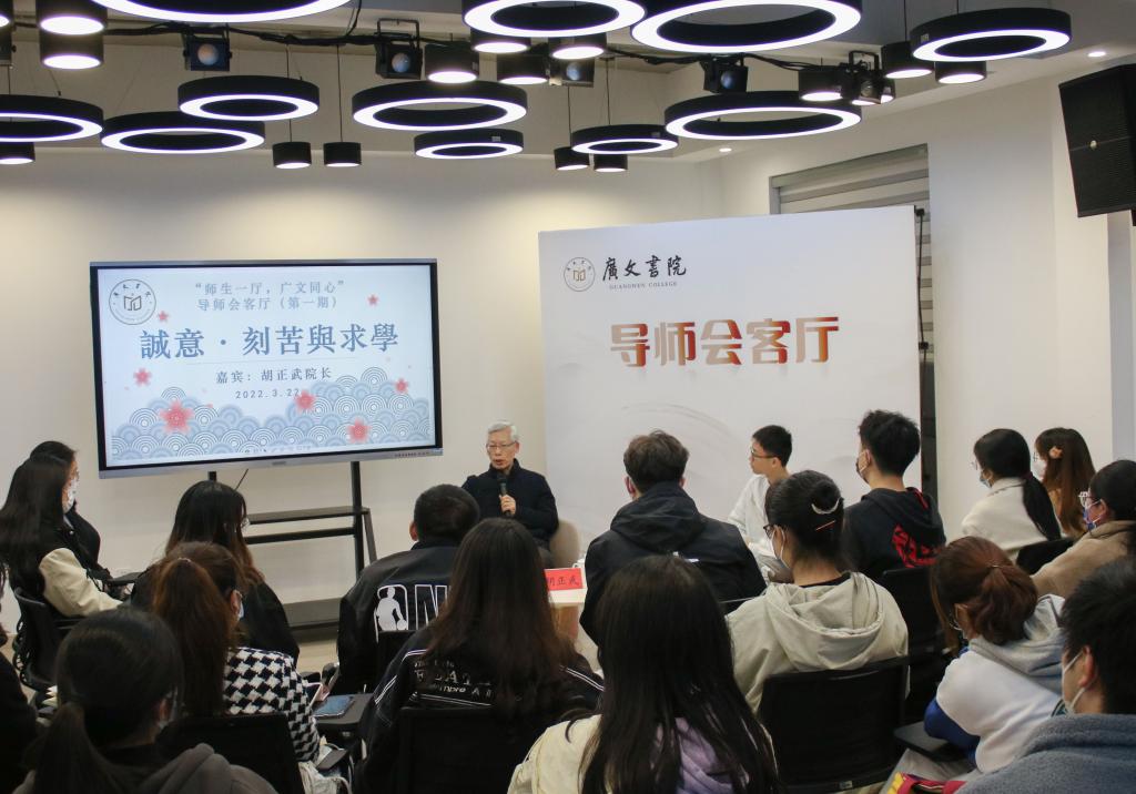 3月22日,第一期导师会客厅在广文书院多功能厅举行。广文书院院长胡正武以“诚意·刻苦与求学”为主题开展交流活动,广文书院辅导员黄廷美与部分书院学员出席活动。本次活动由周锦鹏主持。