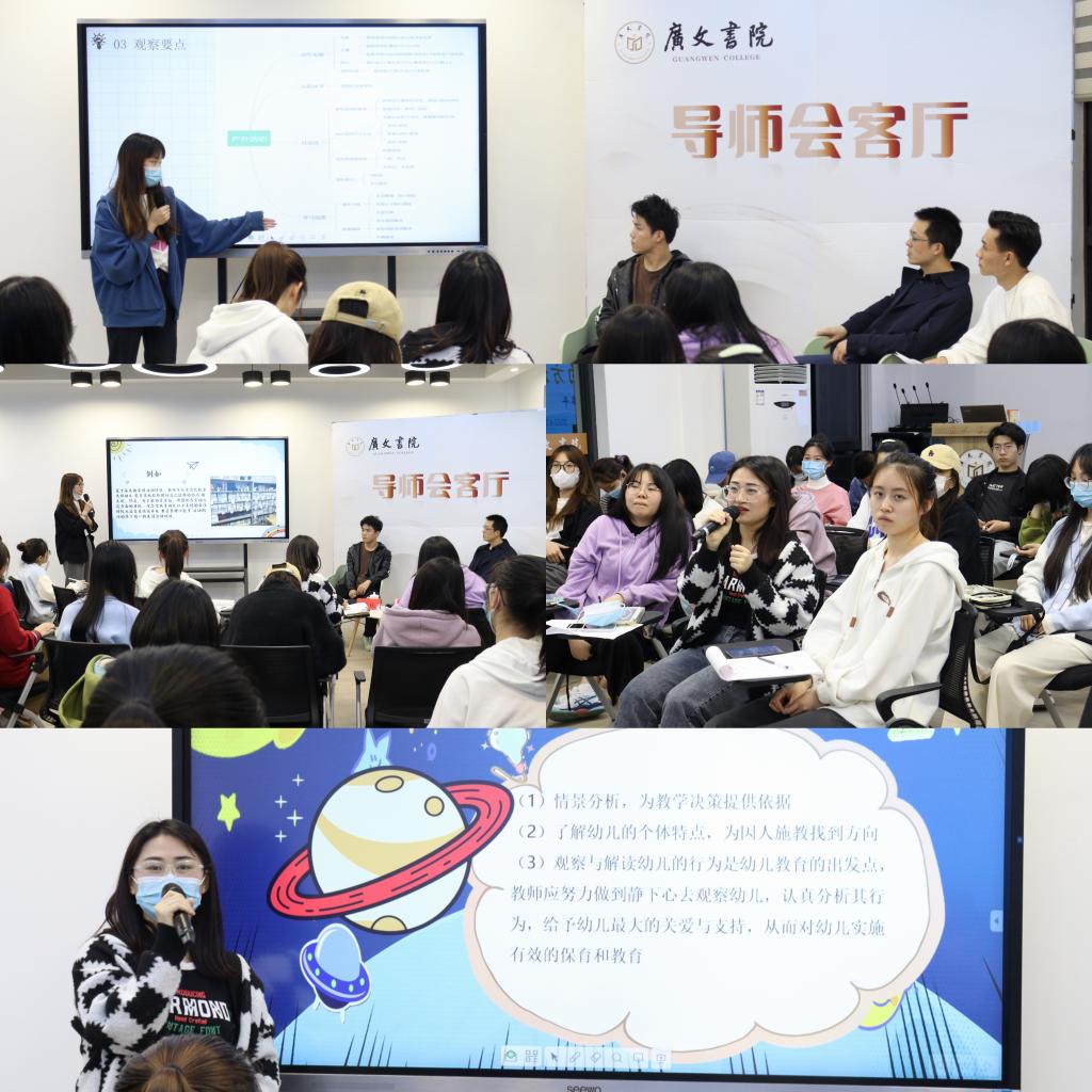 为庆祝广文书院成立两周年,以“幼儿园教师观察与记录的方法”为主题的第四期导师会客厅活动于4月19日在广文书院多功能厅成功举行。此次交流活动由导师王声平主讲,舒建未和苏杭同学主持。本次活动分组进行交流研讨,学术氛围十分浓厚。
