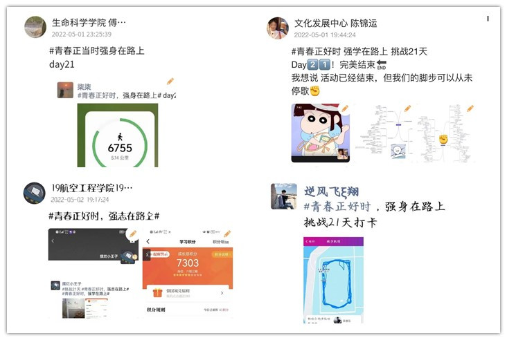 一页页的学习笔记,一张张运动的照片,一次次的“学习强国”的打卡记录……在疫情防控常态化的背景下,4月11日至今,313名心湖学子参与以“高歌青春,习惯使然”为主题的第四季“挑战21天”线上打卡活动。
