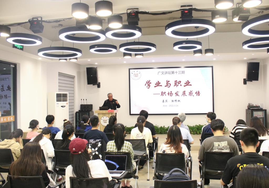5月26日晚,广文书院举行第十三期广文讲坛。本次讲坛主题为:学业与职业——职场发展感悟。由台州市政府决策咨询委员会副主任陆修钗作主讲嘉宾,广文书院院长胡正武,辅导员黄廷美及部分书院成员参加了此次讲座,学员许伟向主持。