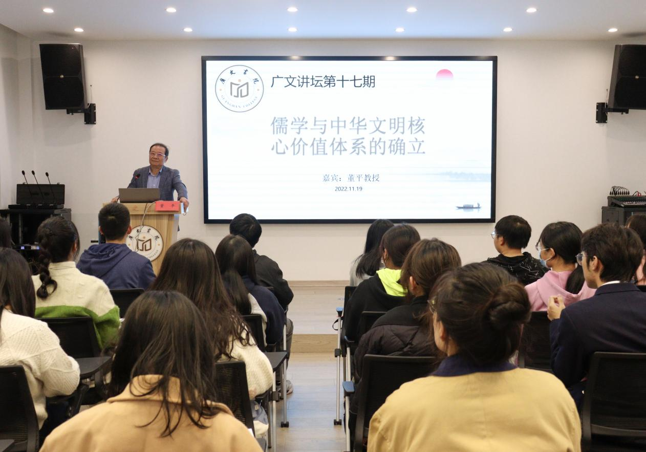 11月19日晚,第17期广文讲坛在临海校区广文书院多功能厅举行。浙江大学“求是”特聘教授、中国哲学博导董平教授为学员们带来题为“儒学与中华文明核心价值体系的确立”的讲座。学工部副部长马斌、广文书院辅导员黄廷美及部分书院学员参加,广文书院院长胡正武主持。