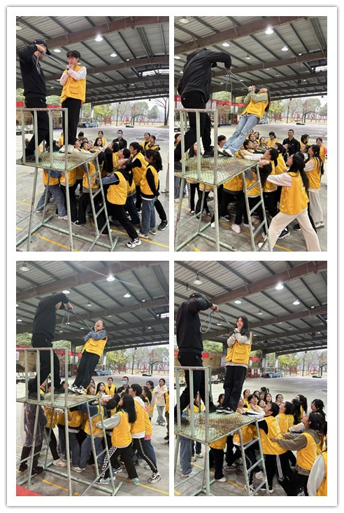 在教练的专业指导和同学们的认真学习下,一双双手臂交织成一张安全的保护网,挑战者依次爬上高台,其中有因为害怕而落泪的、有为队友加油呐喊的、有自告奋勇率先挑战的,在每一声“放心往下倒,我们一定能接住你”的鼓励中,成员们克服了心理障碍,完成挑战。