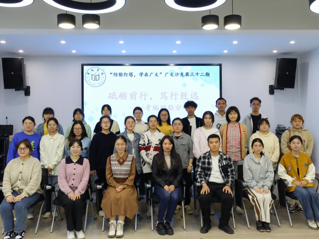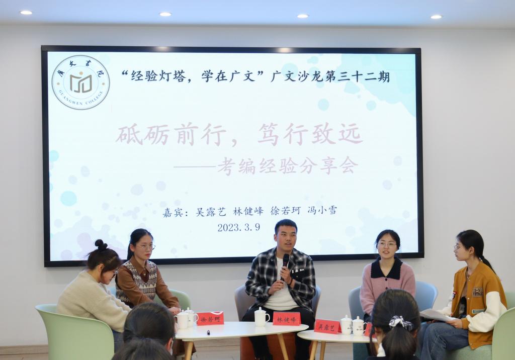 3月9日下午,广文书院在多功能厅举行了以“砥砺前行,笃行致远”为主题的第32期广文沙龙。此次沙龙邀请吴露艺、林健峰、徐若珂、冯小雪四位广文书院学员,分享考编经验,广文书院辅导员黄廷美及部分书院学员参加,书院学员田玲焱主持。