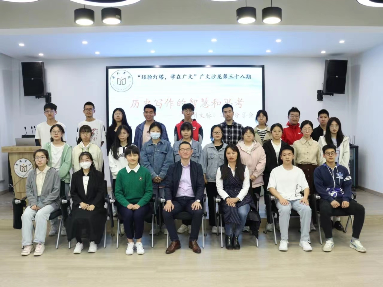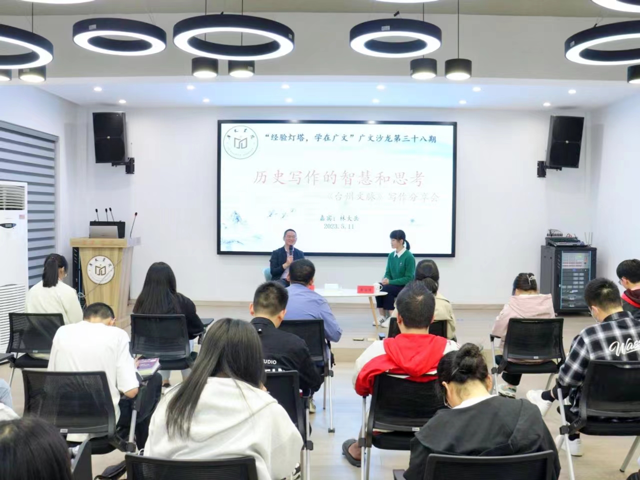 5月11日晚,广文书院在多功能厅举办以“历史写作的智慧和思考——《台州文脉》写作分享会”为主题的第38期广文沙龙。活动邀请台州学院2004届优秀校友林大岳担任分享嘉宾,书院辅导员黄廷美参加交流,书院学生黄泺璋主持沙龙。