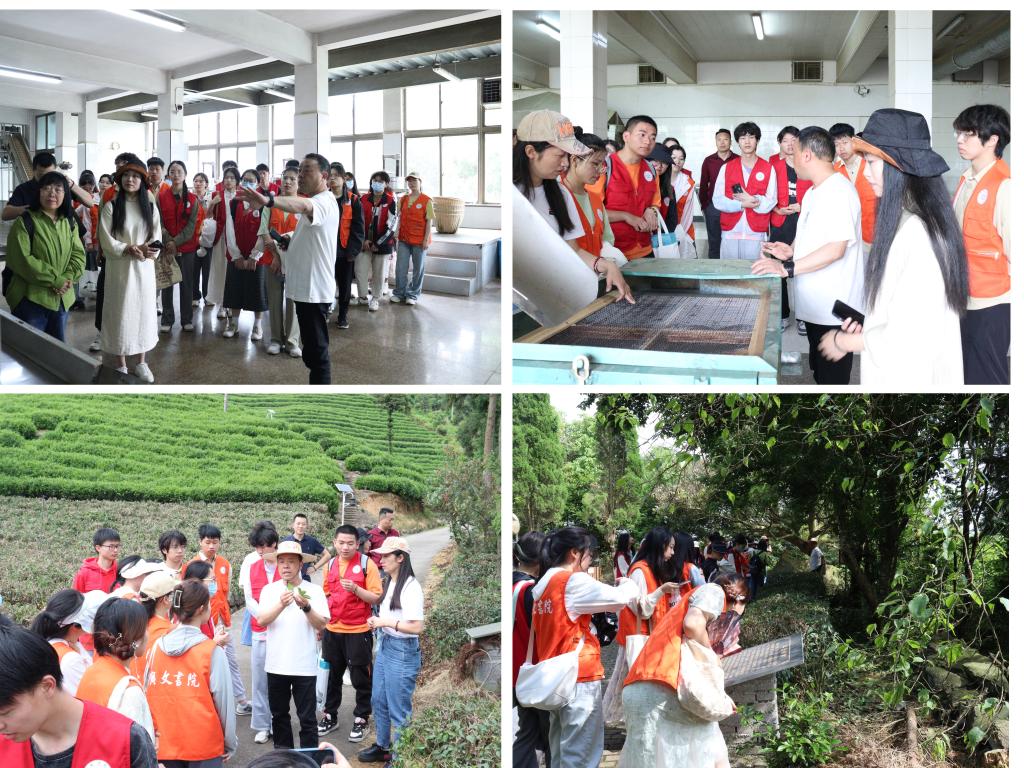 随后,朱朝安带领书院学子参观茶厂生产车间,详细地讲述羊岩勾青的制作过程。茶叶采摘后,需依次经过摊放、杀青、揉捻、炒小锅、炒对锅等工序。成茶后外形呈腰圆,色泽隐绿,汤取色黄绿明亮,香味醇厚,也因此戏称其为“羊岩勾魂”。在此过程中,朱朝安还介绍了茶厂特色专利如色透机、匀摊机等。紧接着,他又带领广文师生前往茶山进行实地鉴赏,茶山每50米为一品种,书院学子边听讲解,边采摘,了解到不少茶叶品种的差异、制茶的技术以及悠久的茶文化。