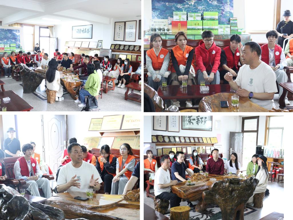 羊岩山茶厂党委书记朱朝安为了让广文师生一到羊岩山就能喝上茶,提前让工作人员在会客厅泡好茶。朱朝安表示,他特别重视在青年一代进行茶文化普及和兴趣培养。悠悠茶韵勾往事,朱朝安分享了他与羊岩山的故事,并以其父辈和自身的经历阐述了羊岩山 “自强不息,艰苦奋斗,科学求精,开拓进取” 精神,教导年轻人要学会吃苦耐劳,希望同学们艰苦奋斗不负老一辈的心血。他号召更多青年人加入茶产业成为“现代农民”,利用科技更好进行茶叶培养。