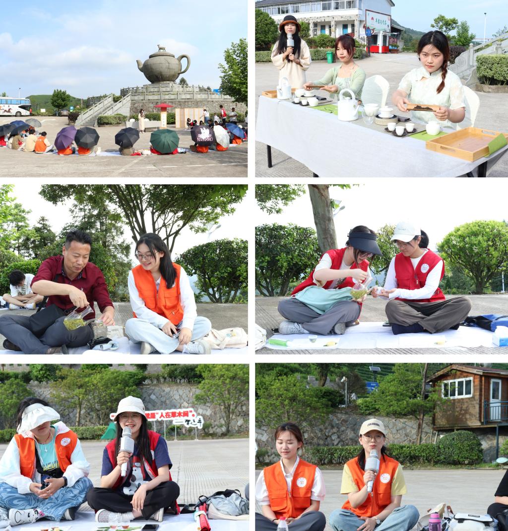 经过参观、鉴赏、采摘,大家又来到了“茶壶”景点的一片平地,进行“无我”茶会。徐凤君提到,“无我”茶会是一种参加者自带茶叶、茶具,人人泡茶,人人敬茶,人人品茶,一味同心的茶会形式。在她的主持和引导下,书院学子分成两组进行红茶和绿茶冲泡的茶艺展示。学子们纷纷展示所学的茶艺知识,净手、汤器、请茶、洗茶、泡茶、拂盖、封壶、分杯、回壶、分茶、奉茶、闻香、品茗,无论是茶道文化,还是茶艺文化,学子们将理论转化成实践,不断提升自身素养与才能。