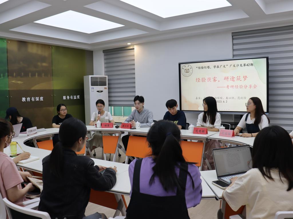 6月2日晚,广文书院在师生研讨室(三)举行了以“经验拨雾,研途筑梦”为主题的第42期广文沙龙。范思颖、赵程程、范欣怡以及娄以恒四位同学担任分享嘉宾,书院辅导员黄廷美及部分学生参加,学生谢慧主持沙龙。