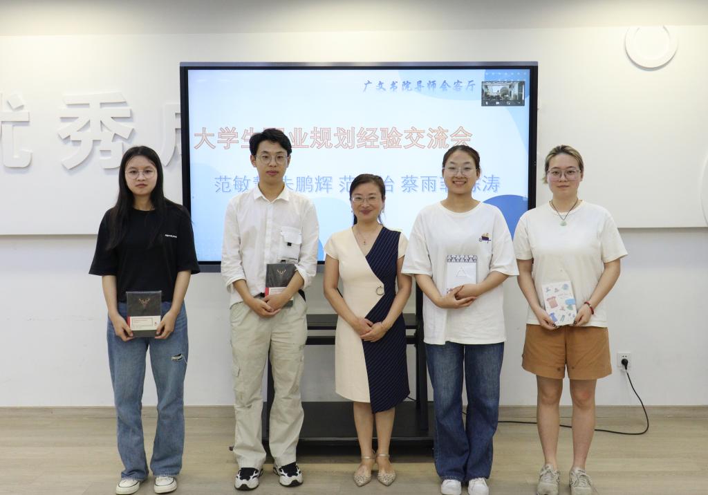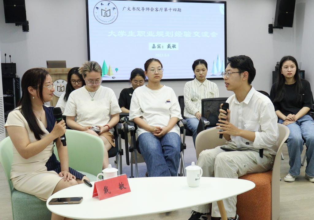 6月6日晚,广文书院在多功能厅举办以“大学生职业规划经验交流会”为主题的第14期导师会客厅。书院导师戴敏和她的学生范敏慧、朱鹏辉、范欣怡和蔡雨菲担任分享嘉宾,部分书院学生参与活动。
