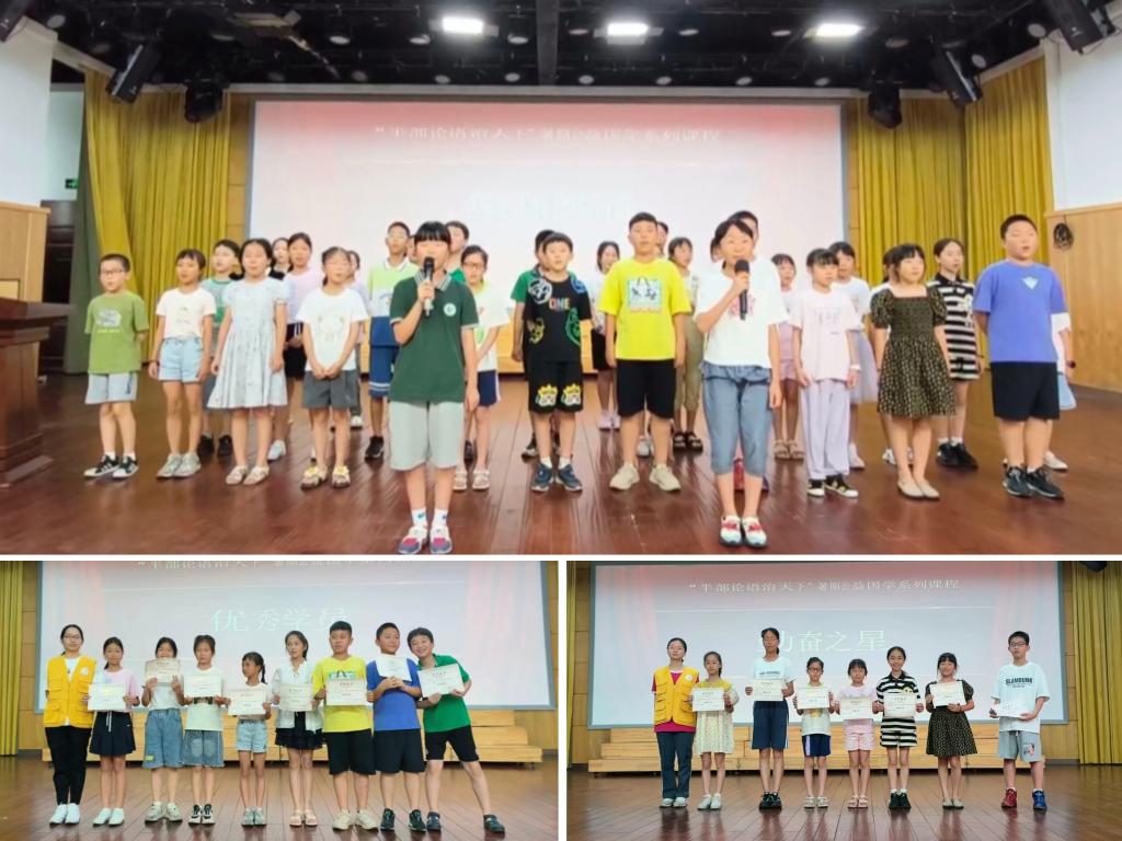 颁奖音乐响起,书院志愿者们给第一期国学班表现优秀的学生们颁发奖状。一张小小的奖状,是对他们在课程中努力学习的肯定。随后,进行了由詹佳怡和杨晨曦领背,第一期全体学生共同参与的诵背活动,“学而时习之,不亦说乎....”,抑扬顿挫的背书声在会场回荡,充分展现了他们学习的努力和内心的自信。最后,活动以大合影的形式拉上帷幕。