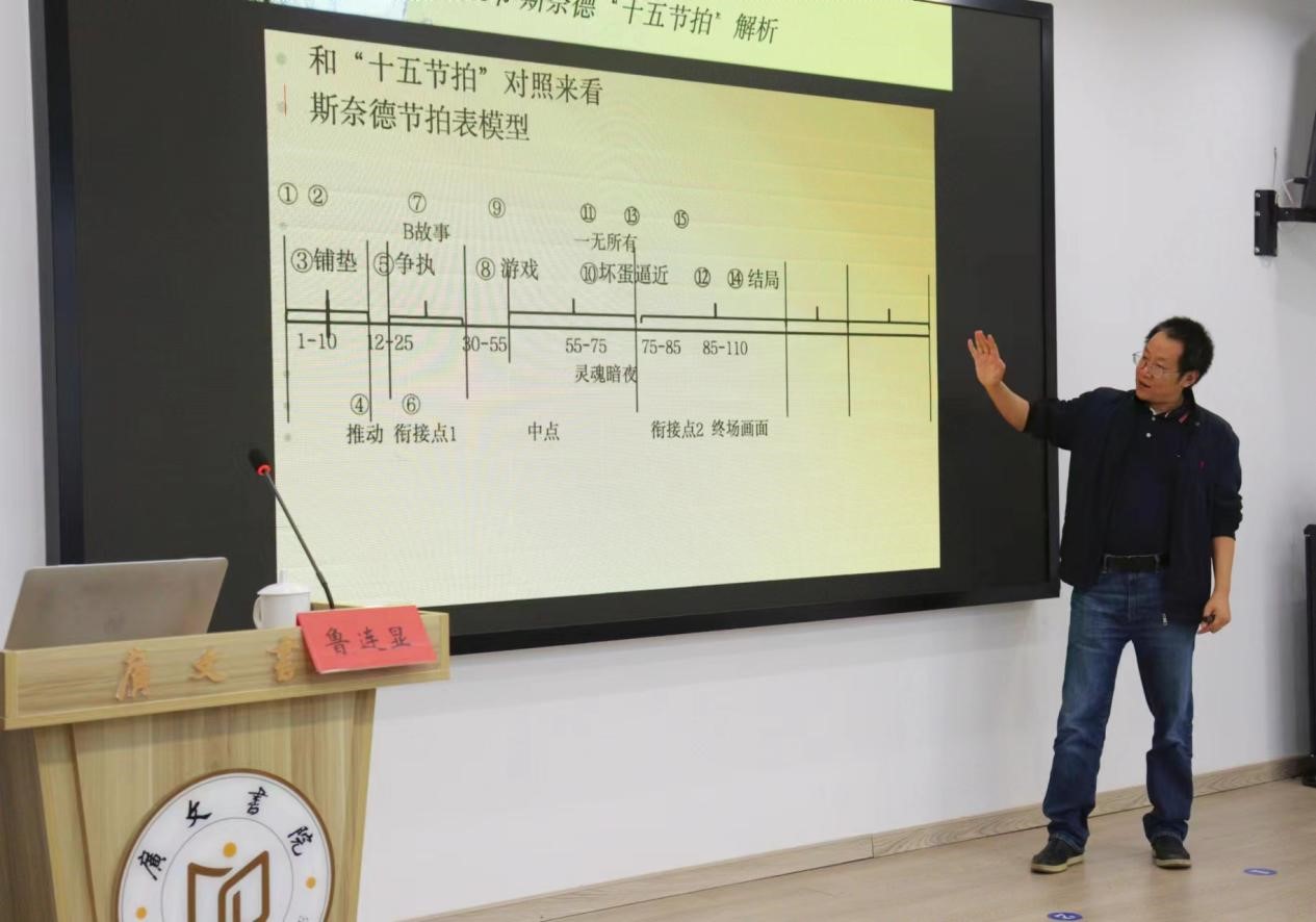 鲁连显从世界最知名电影公司入手,介绍了好莱坞电影百年发展史以及“大投入、类型化、工业化”的特色。鲁教授以经典影片《角斗士》和《银河护卫队1》为例,结合悉德·菲尔德剧作“三幕式”结构,斯奈德“十五节拍”模型等多个电影剧作概念,为学生解码好莱坞电影。