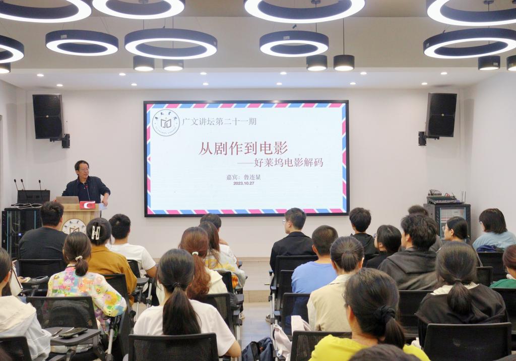 10月28日晚,广文书院举行第二十一期广文讲坛。本次讲坛主题为以“从剧作到电影——好莱坞电影解码”,由浙江传媒学院华策电影学院鲁连显教授主讲。广文书院副院长金旭球及60多名书院学生参加讲坛。