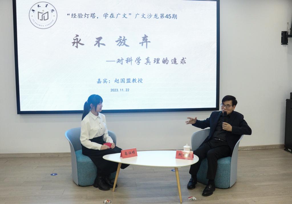 11月22日晚,美国加州州立大学洛杉矶分校终身教授、台州市“500精英计划”高端人才赵国盟教授应邀作客广文沙龙第45期活动,为广文书院师生作“永不放弃——对科学真理的追求”的主题交流。书院副院长金旭球及50多位书院师生参加了此次沙龙活动。