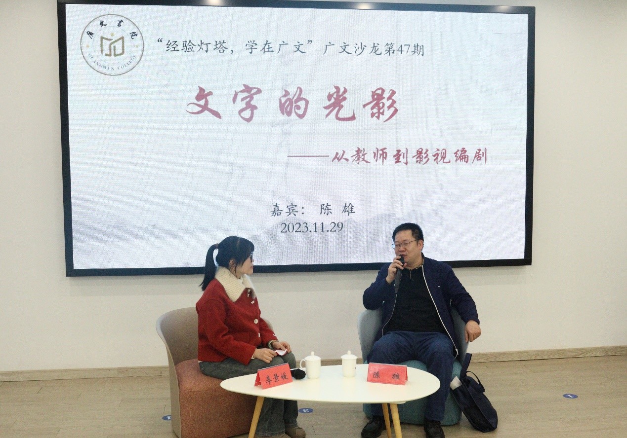 11月29日晚,国家一级编剧,中国电影家协会会员,中国电视艺术家协会微视频微电影专业委员会副会长陈雄应邀作客广文沙龙第47期活动,为广文书院师生作“文字的光影——从教师到影视编剧”主题的交流。书院副院长金旭球及部分学生参与了此次活动。