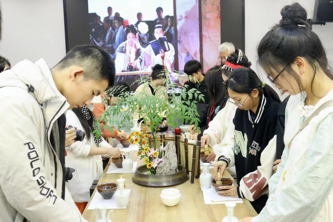 “采菊东篱下,悠然见南山”,徐老师阐释了以蓝天竹、菊花搭配而成的插花花语,让学生们能够体会其中的闲适意境。本期茶会展示了“红茶盖碗冲泡法”“冰清玉洁玻璃杯绿茶冲泡法”以及现场教授宋代点茶。首先,徐老师讲解了冲泡的手法以及相关的茶具,让学生们对茶艺知识有了更加深入的理解。“礼者敬人也,仪者形式也”,学生们为现场的老师与同学进行了奉茶,学习奉茶礼仪。冲泡法和奉茶礼展示完毕后,徐老师向大家讲述了中国茶艺发展史及茶艺东传的梗概;胡院长则介绍了古代分茶艺术传播及其式微于国内,导致古代文学作品解读出现失误的情况,希望同学们学好茶艺,领会茶道的内涵,由术臻道,振兴分茶艺术。最后,徐老师以普洱茶为例讲解示范了宋代点茶:温盏,调膏,注水击沸,达到雪乳云汤的状态,做茶丹青、分茶、品饮。学生们跟随徐老师亲身体会了点茶的乐趣。闻香品茗,细尝茶点,伴随着典雅的音乐,与会人员沉浸在茶会带来的平静安宁的气氛中。