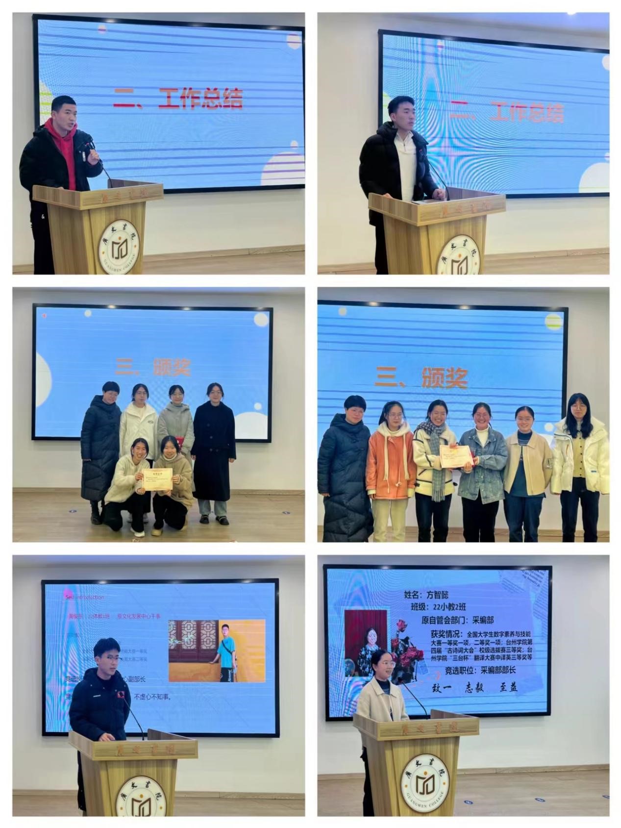 随后,书院自管会各部门负责人依次上台进行工作汇报。各位负责人分别总结了一年的工作,肯定了学弟学妹的成长,希望他们能够秉持初心,积极进取,携手合作,继续做好书院各方面的工作。院长胡正武和副院长金旭球为他们颁发了奖状。
