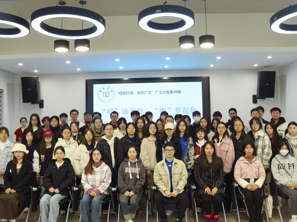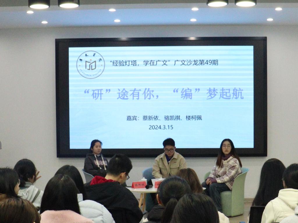3月15日晚,广文书院在多功能厅开展了以“‘研’途有你,‘编’梦起航”为主题的沙龙活动。活动邀请教师教育学院学前教育专业蔡新依、楼柯佩和小学教育专业骆凯祺三位成功“上岸”的同学作为本次嘉宾。书院部分书院学生参与了此次活动。
