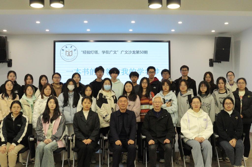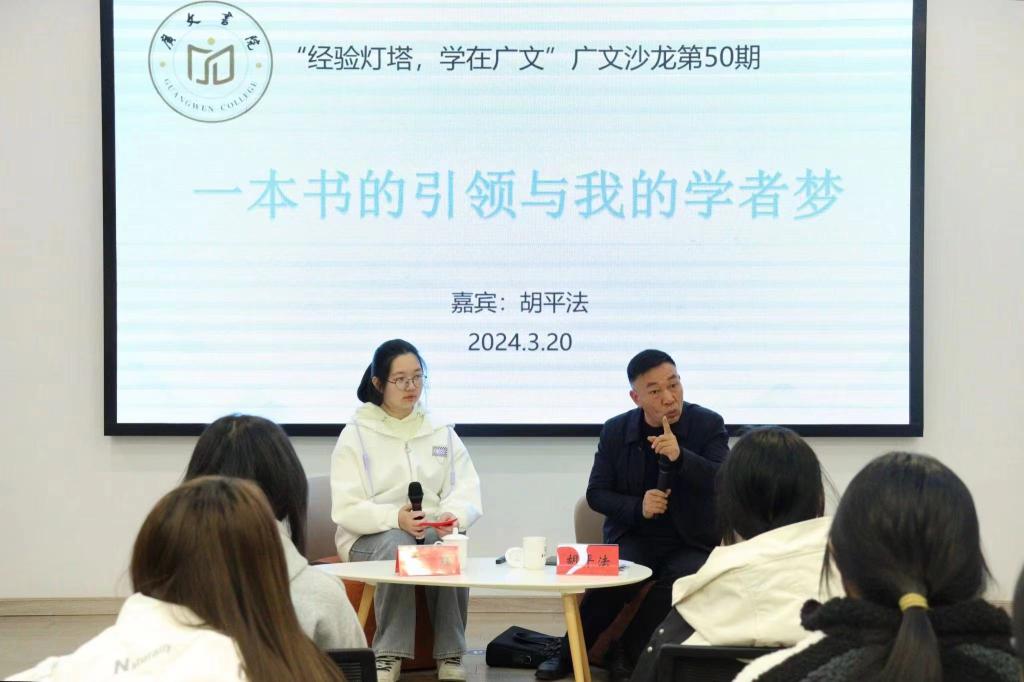 3月20日晚,广文书院在多功能厅举办了以“一本书的引领与我的学者梦”为主题的沙龙活动,邀请了“台州市藏书状元”胡平法担任主讲嘉宾,部分书院学生参加活动。
