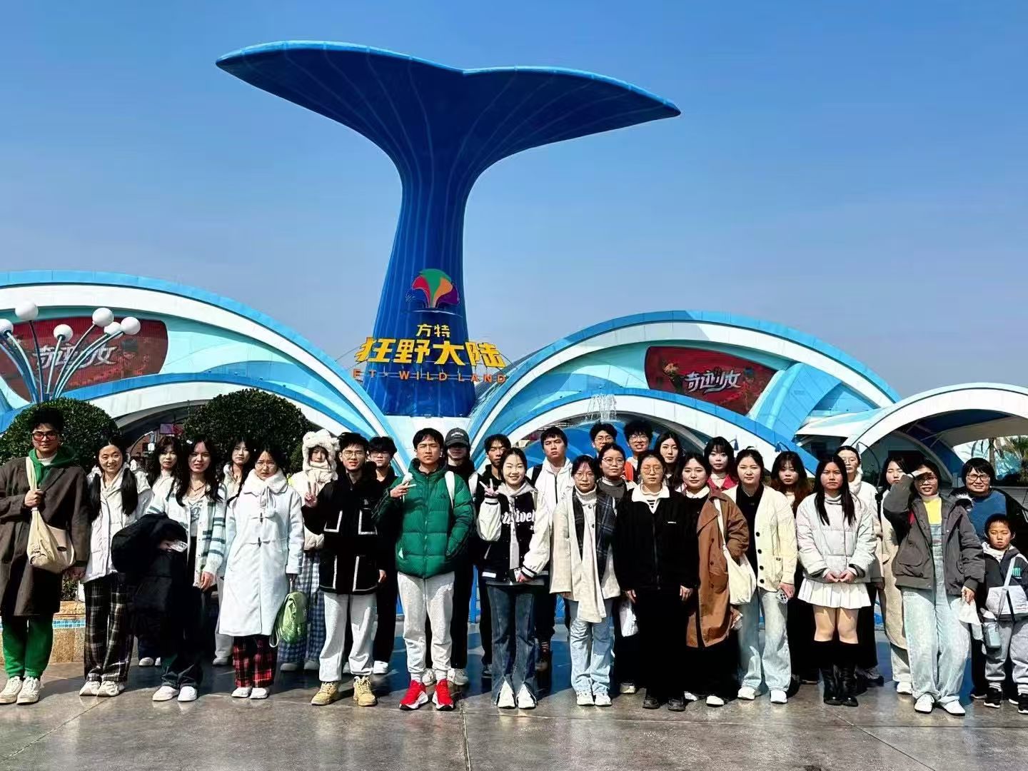 在方特狂野大陆的集体出游合照,大家在主题乐园入口处同框,定格下轻松欢快的集体活动时刻。